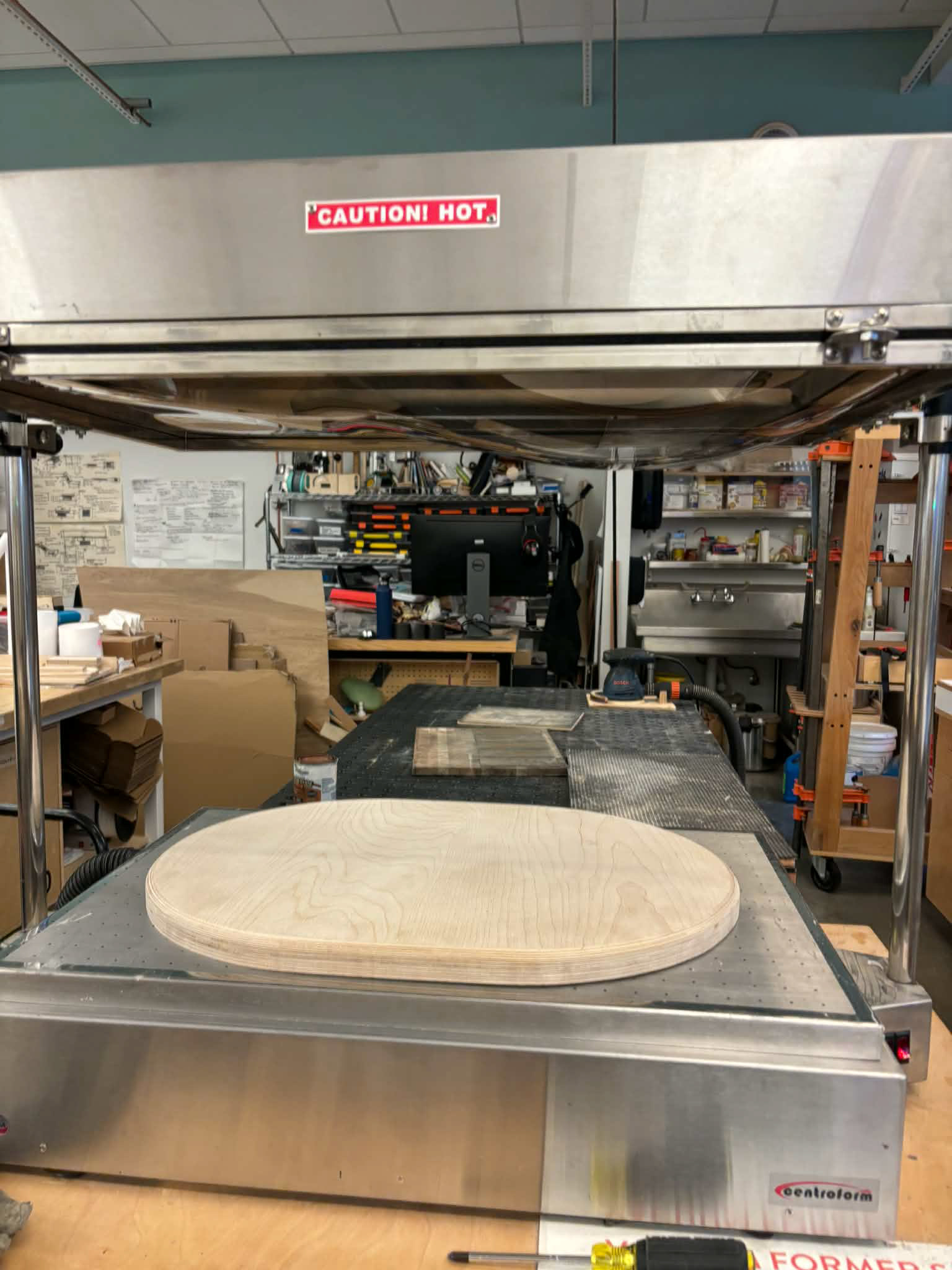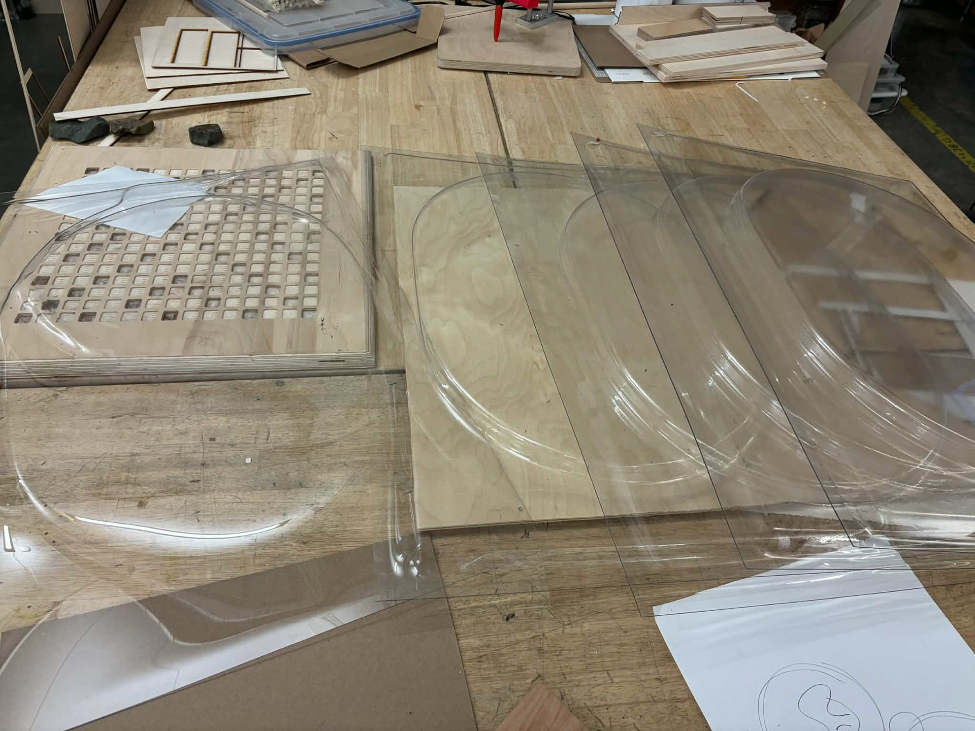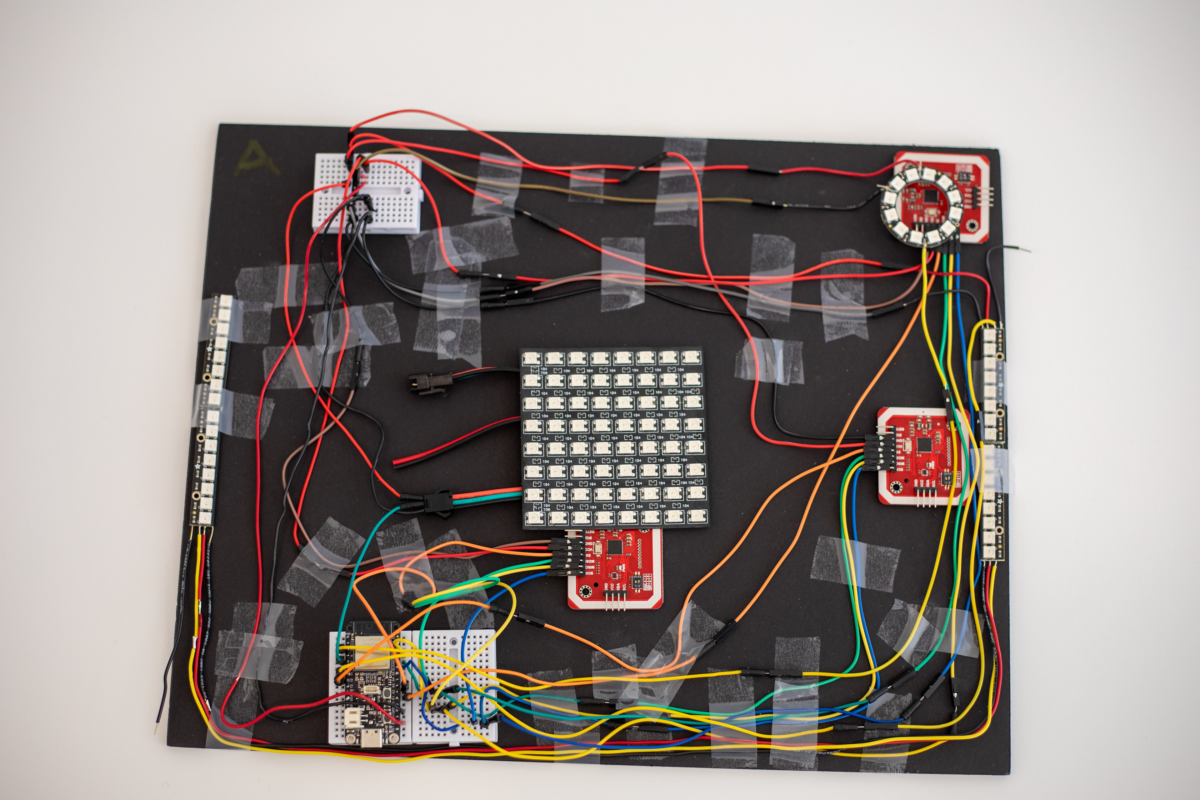 The prototype evolved through iterative fabrication, from early 3D-printed forms to a vacuum-formed final surface integrating NFC, microcontrollers, and programmable lighting.