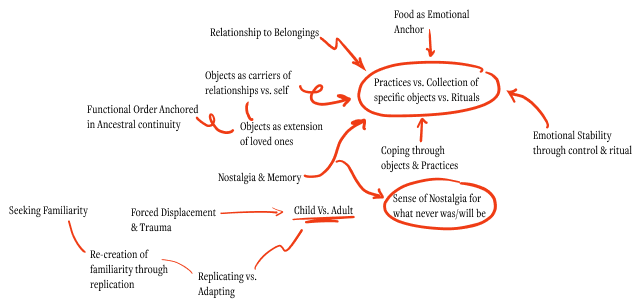 The project was grounded in trauma-informed, participatory, and culturally contextualized design practices. Semi-structured interviews and cultural probes were conducted with individuals who have experienced forced displacement, focusing on how they attempt to reestablish comfort and familiarity in their current homes.